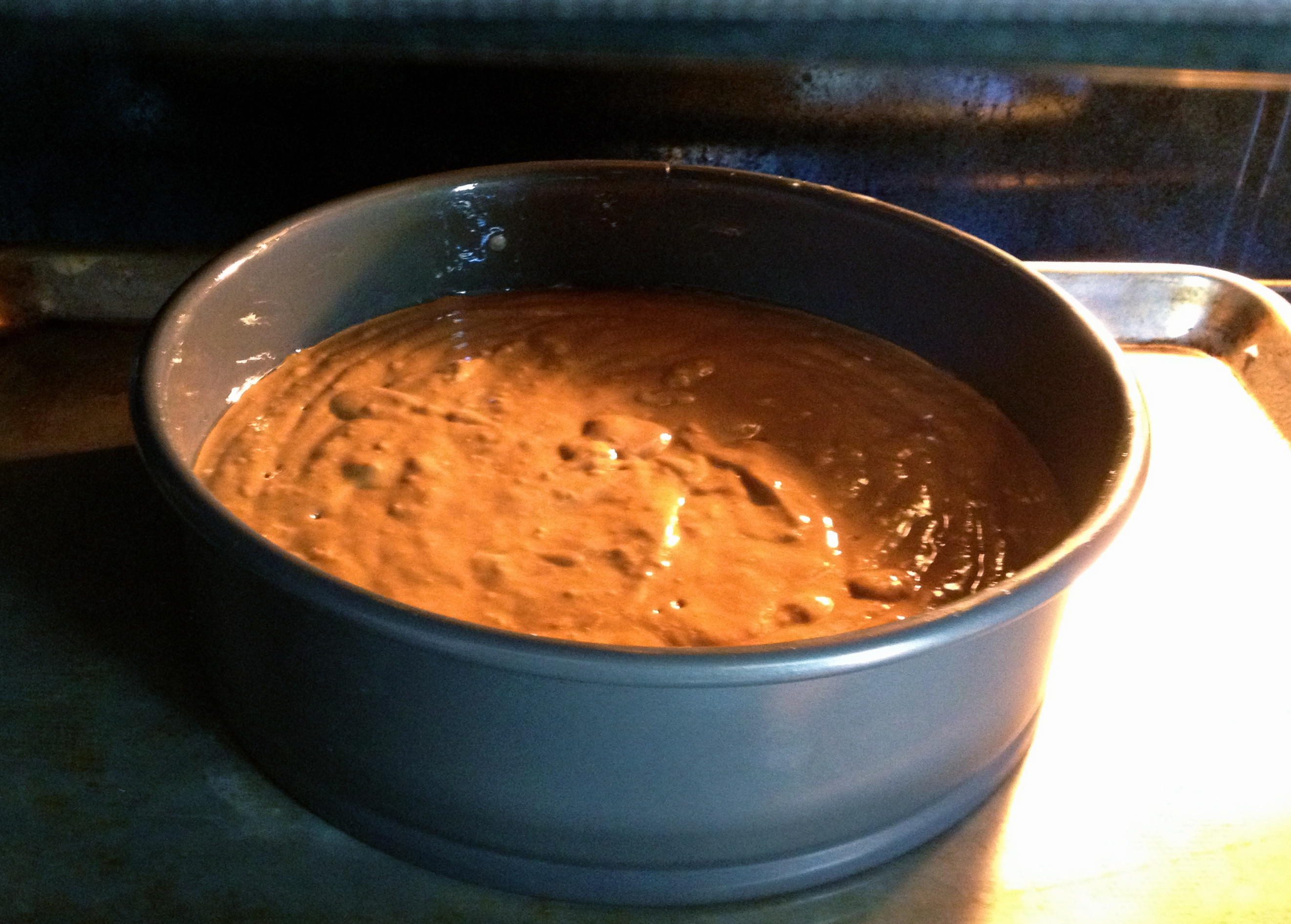 Fill your prepared pan and place on a baking sheet in the oven. Bake for an hour or until a toothpick or a wooden skewer comes out clean. Let the cake cool a bit in the pan before you remove the ring from the springform pan. Not too long though its lovely served warm.
