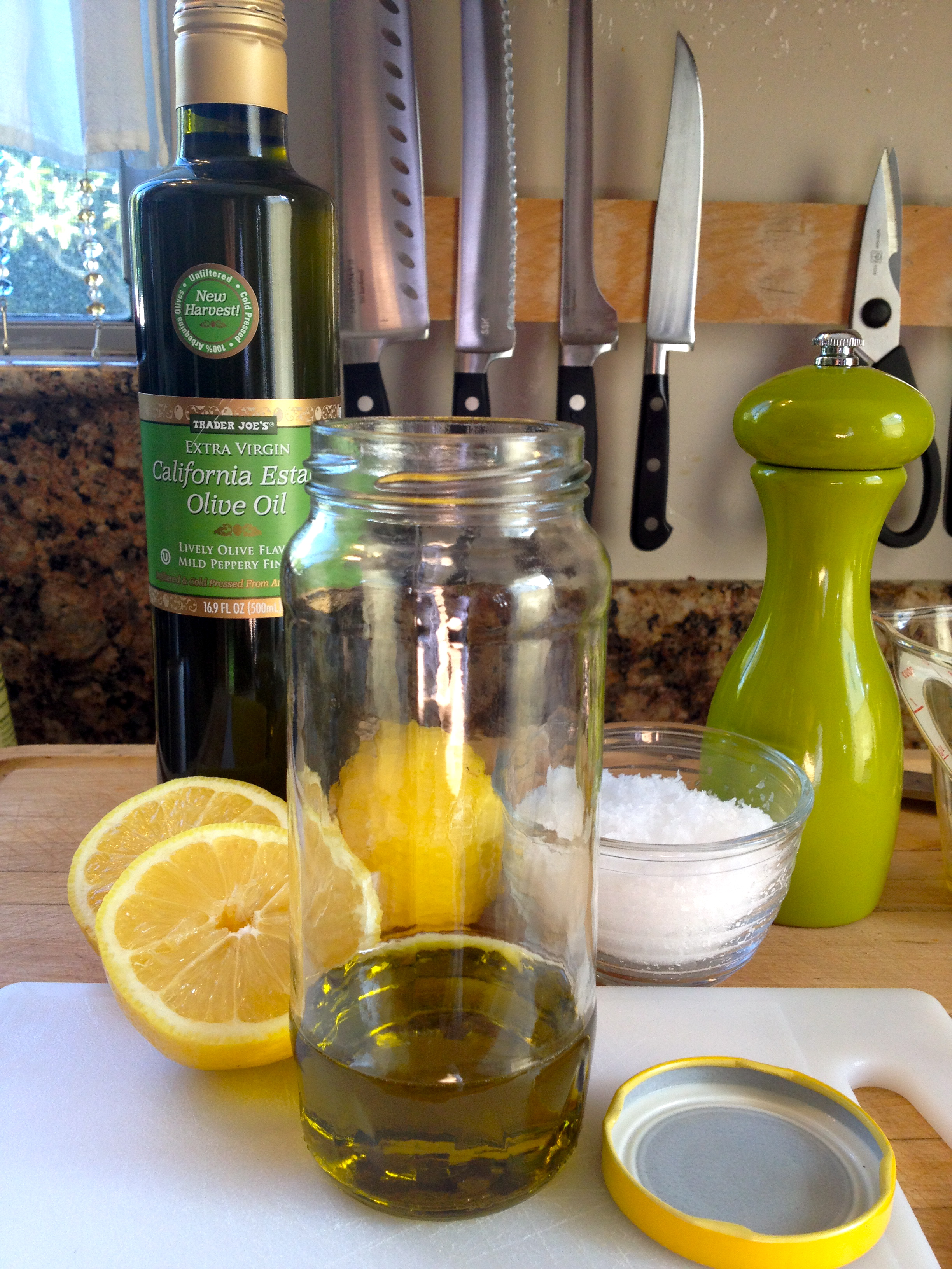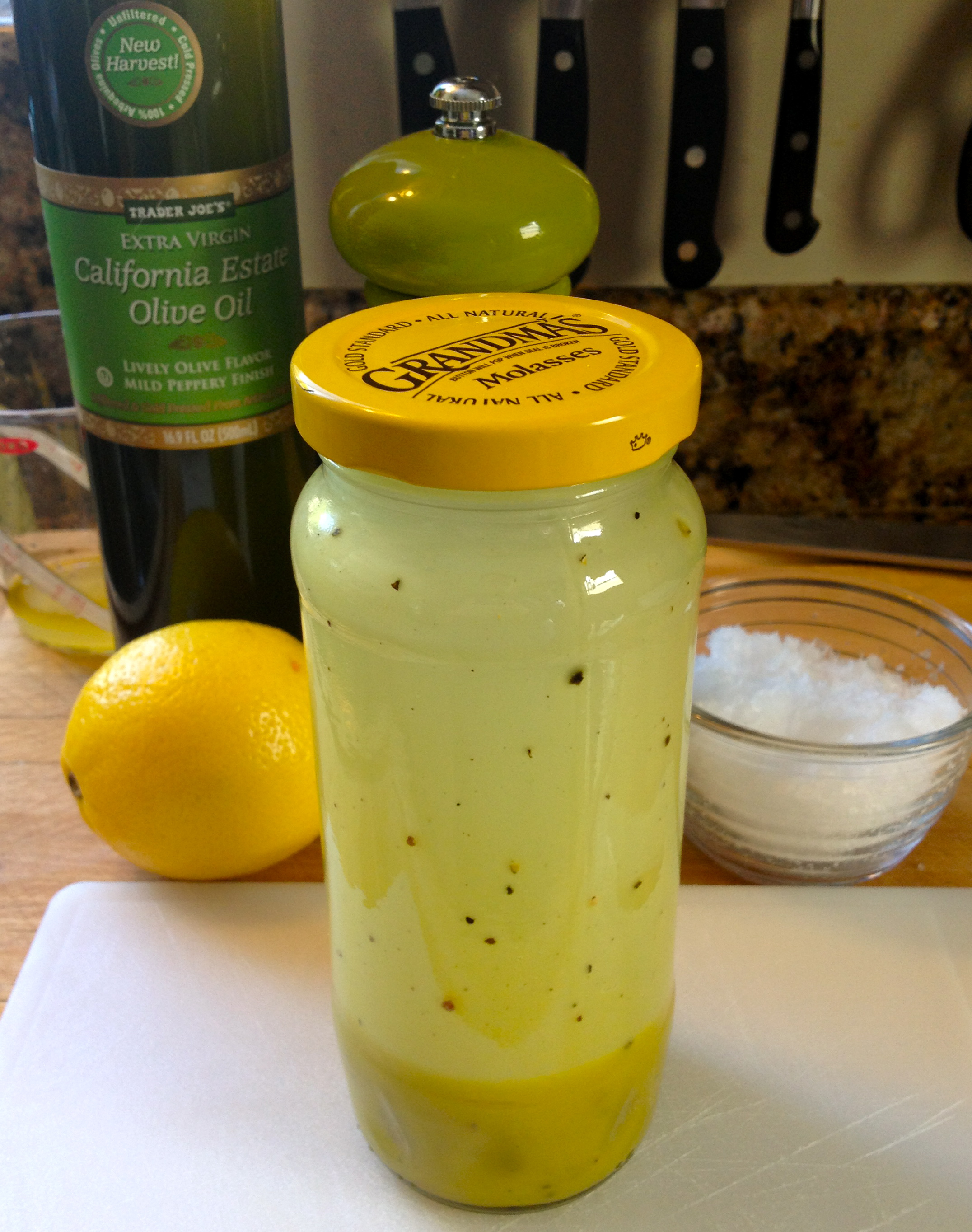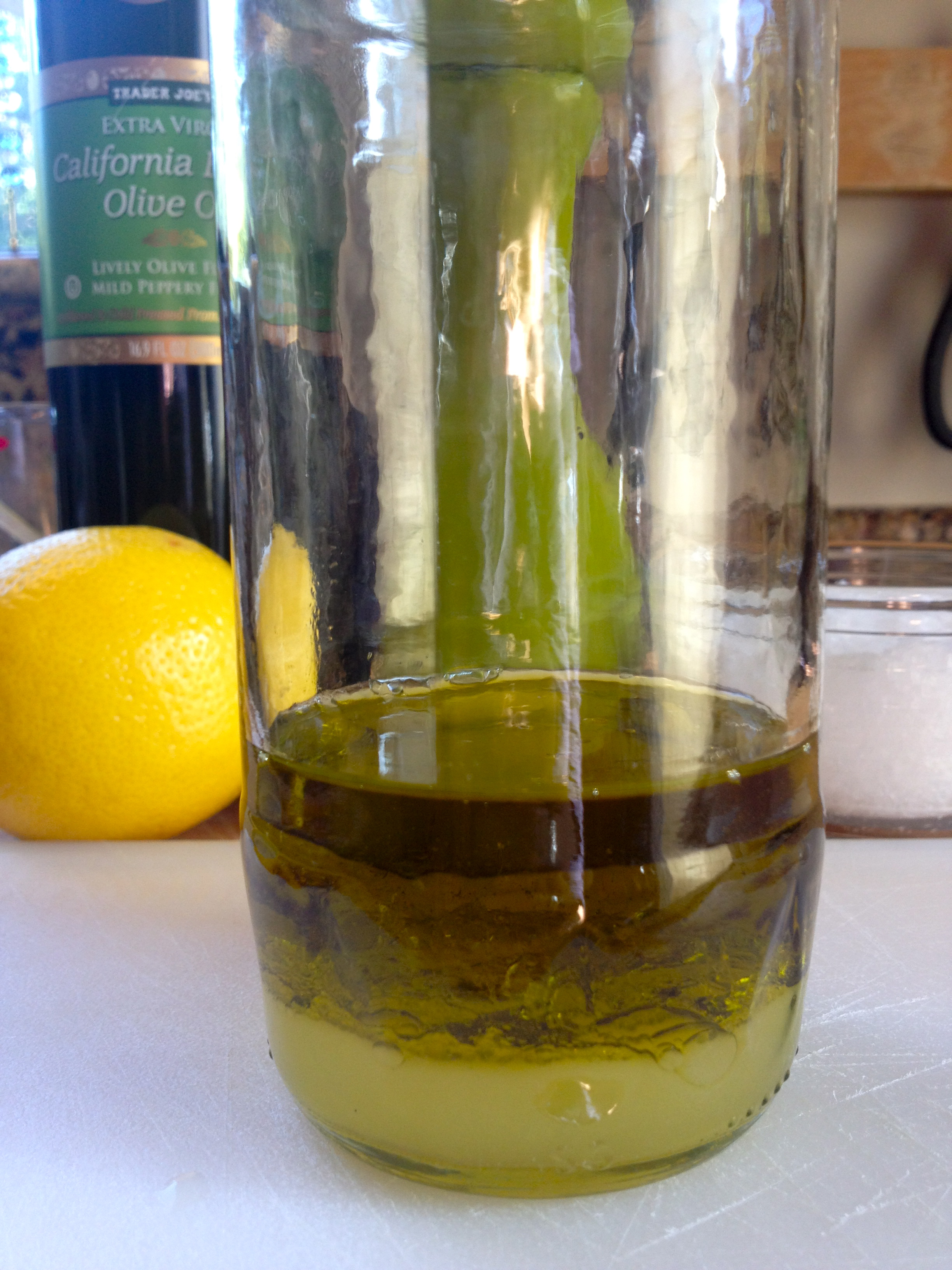 The perfect simple salad dressing. The simplest combination of ingredients, the bright acidity of the lemon and green grassiness of the olive oil, seasoned well with sea salt and pepper. April talks about using this dressing on grilled fish and boiled potatoes. I could slather it on so much more…..