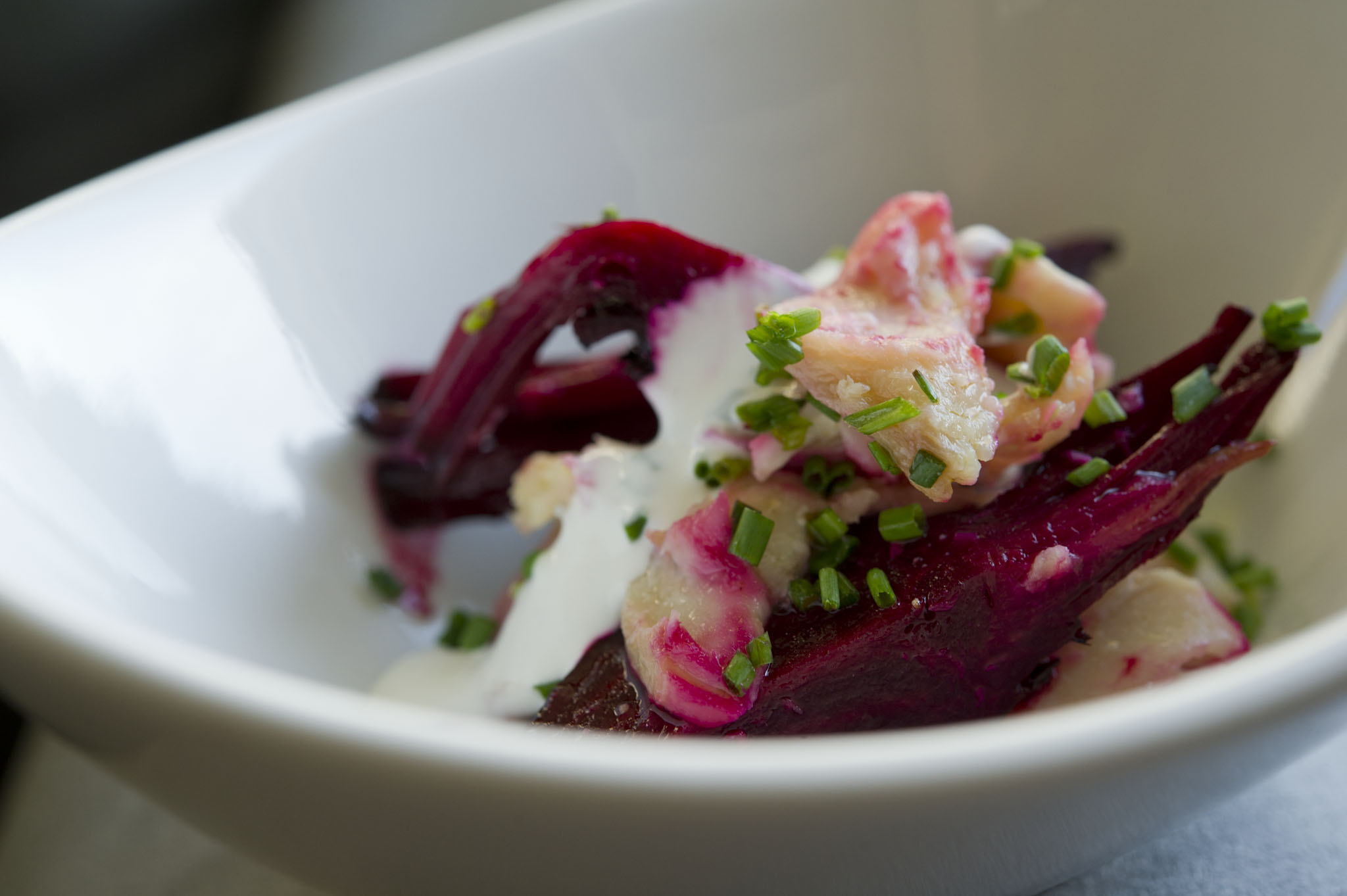 April describes this dish as being full of contrasts. The beets are warm and sweet, the smokey trout is salty, flaky and tender, then the creme fraiche joins in to refresh your palate.