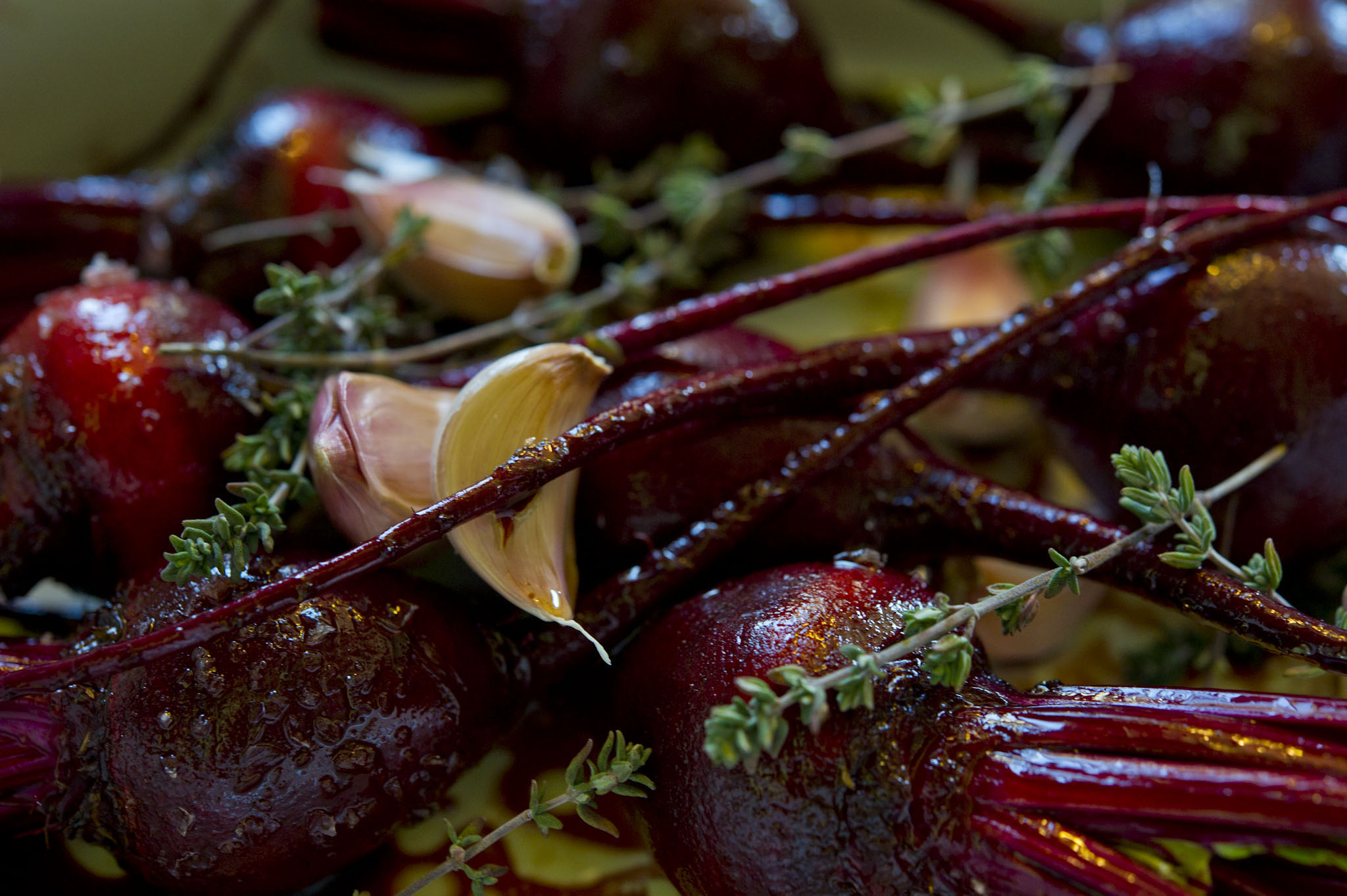 Put them in a baking dish, make sure to scrap all the oil from the bowl and pour over the beets, add the sprigs of thyme and the skin on garlic gloves.