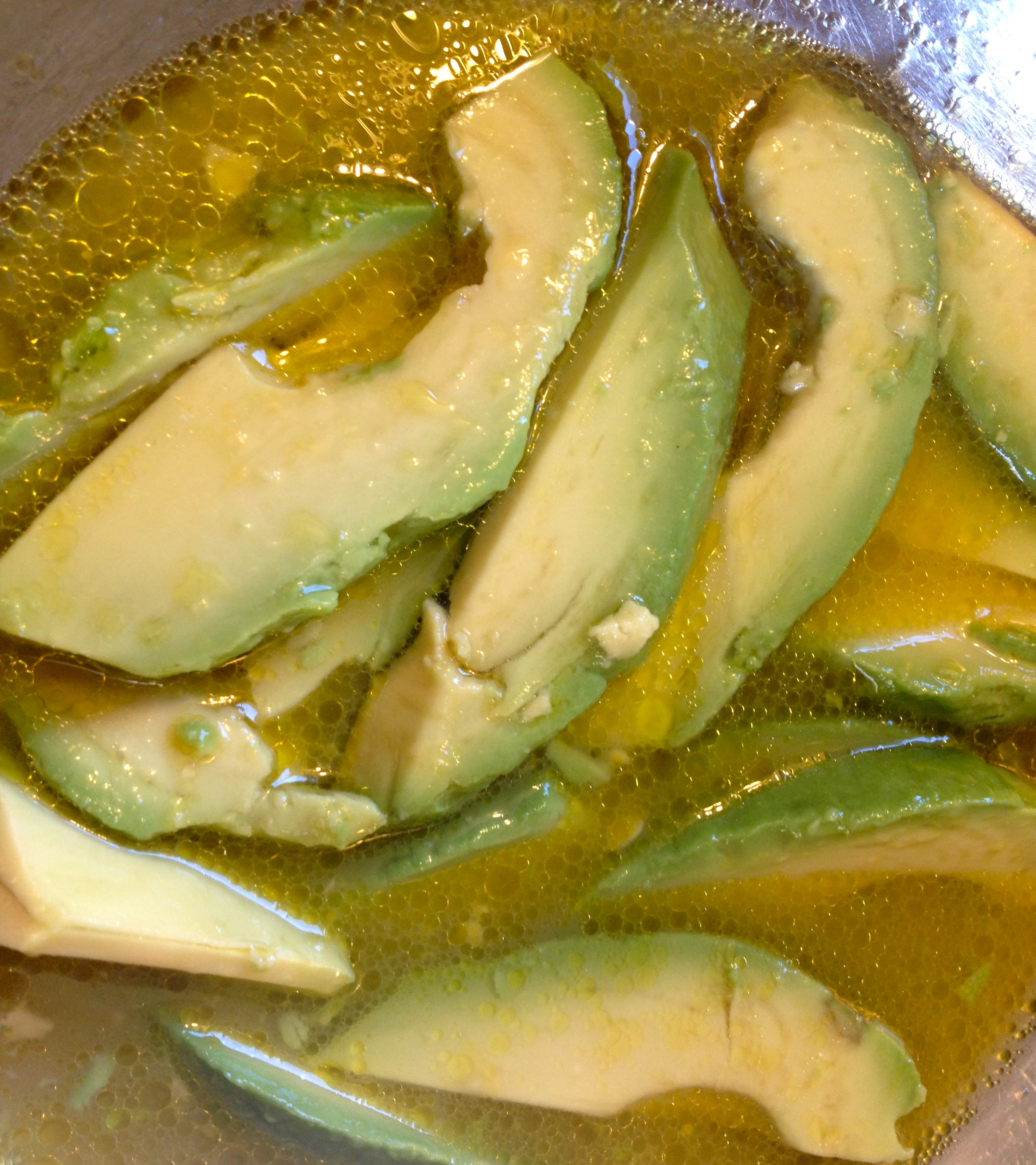 Now ready your avocados, slice in long pieces, add the lemon juice, the orange juice from the segmented oranges and 2 tablespoons olive oil in a large mixing bowl.