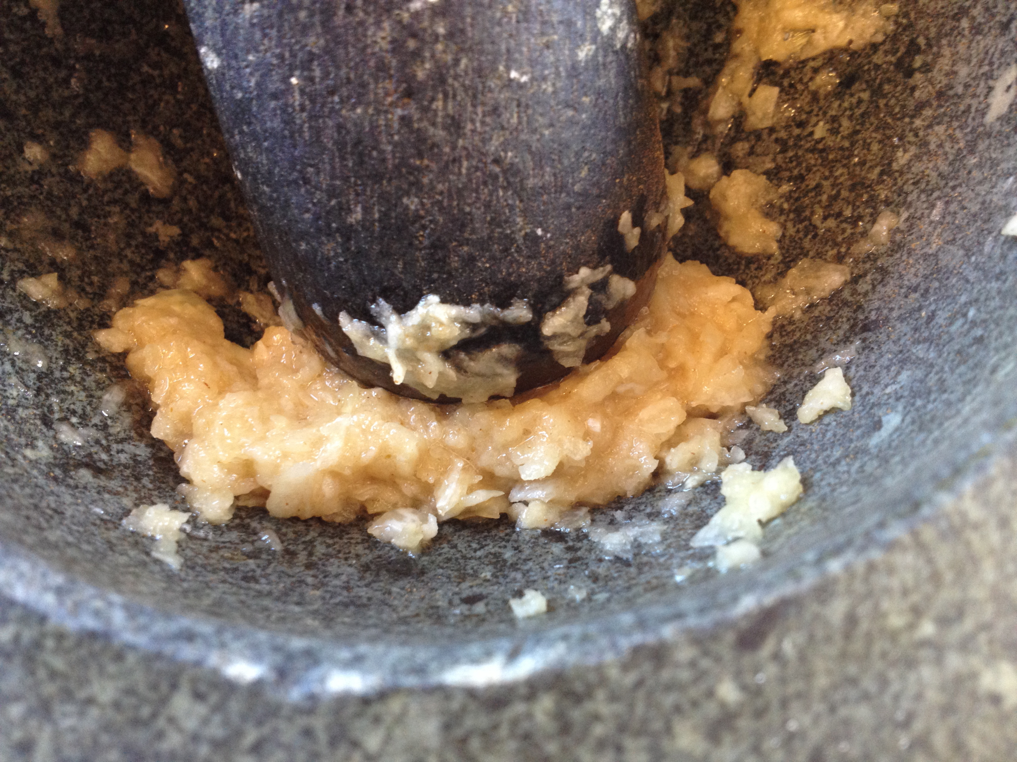 Wipe out the mortar and pestle, addย the garlic and salt together and smash until it resembles a paste.ย
