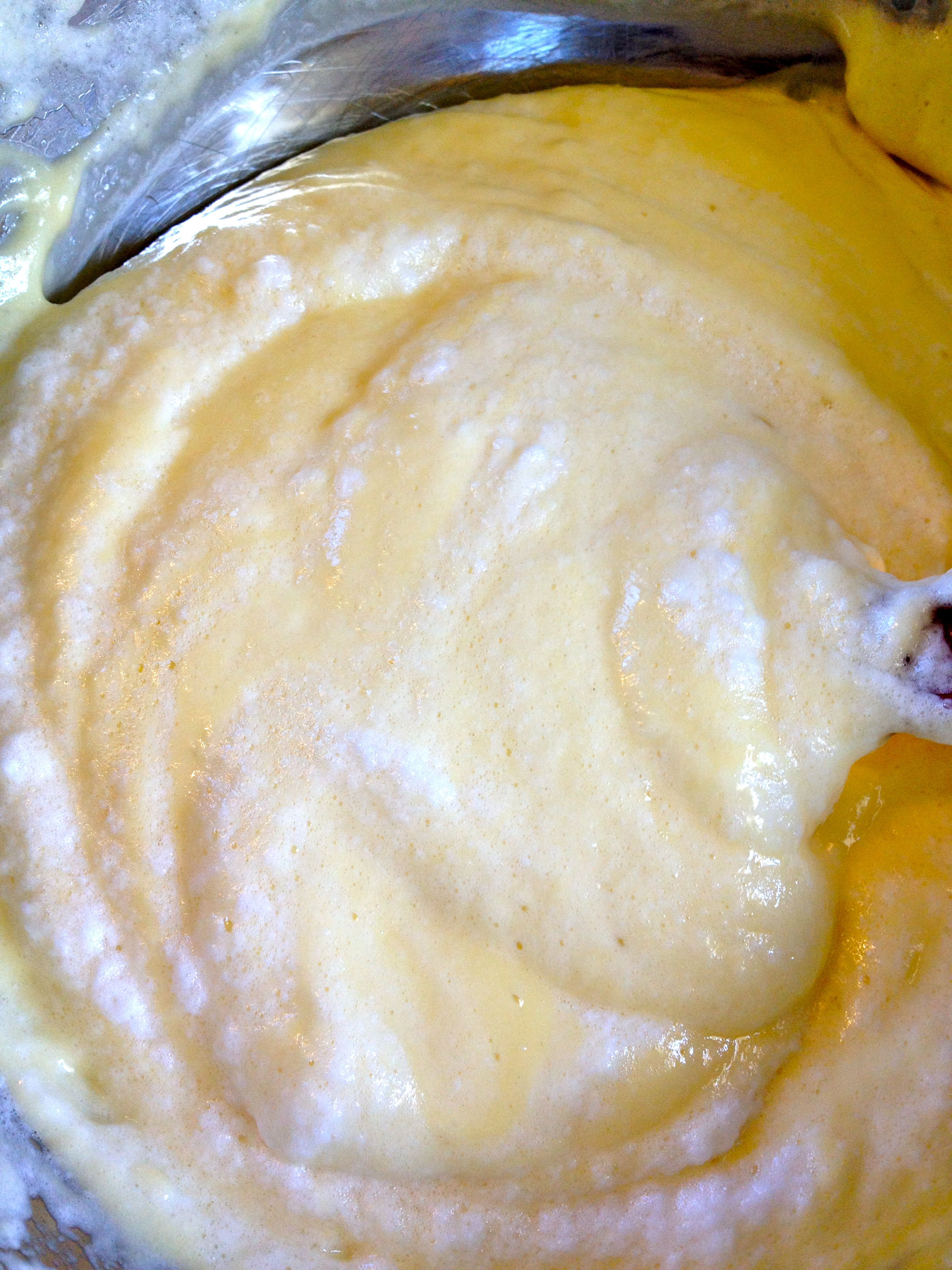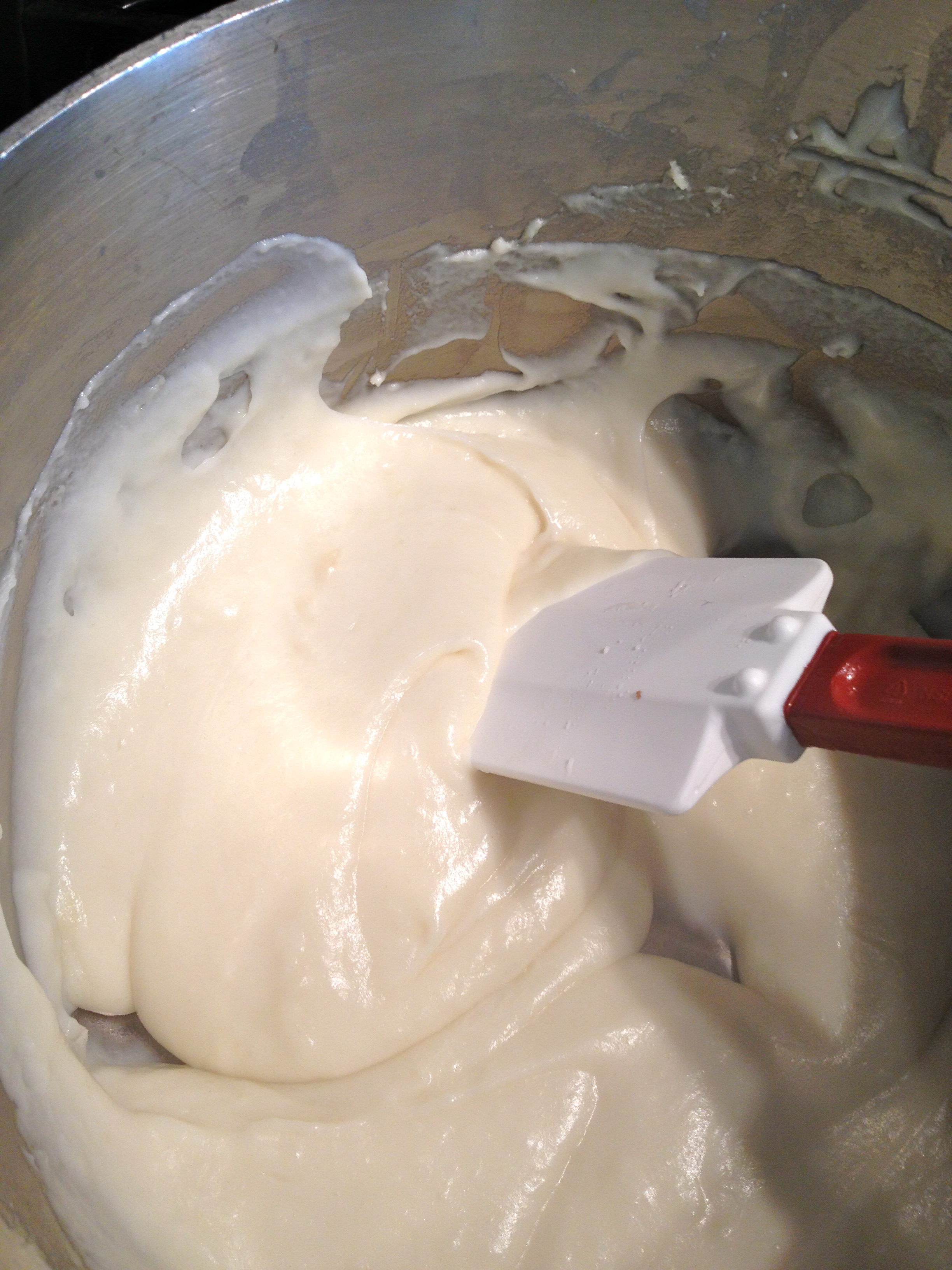 Fold the whites into your smooth cheesy mixture, very carefully. Try your best not to deflate all that air you whipped into those whites. If there are bits of egg white still showing, no biggie, just go with it.