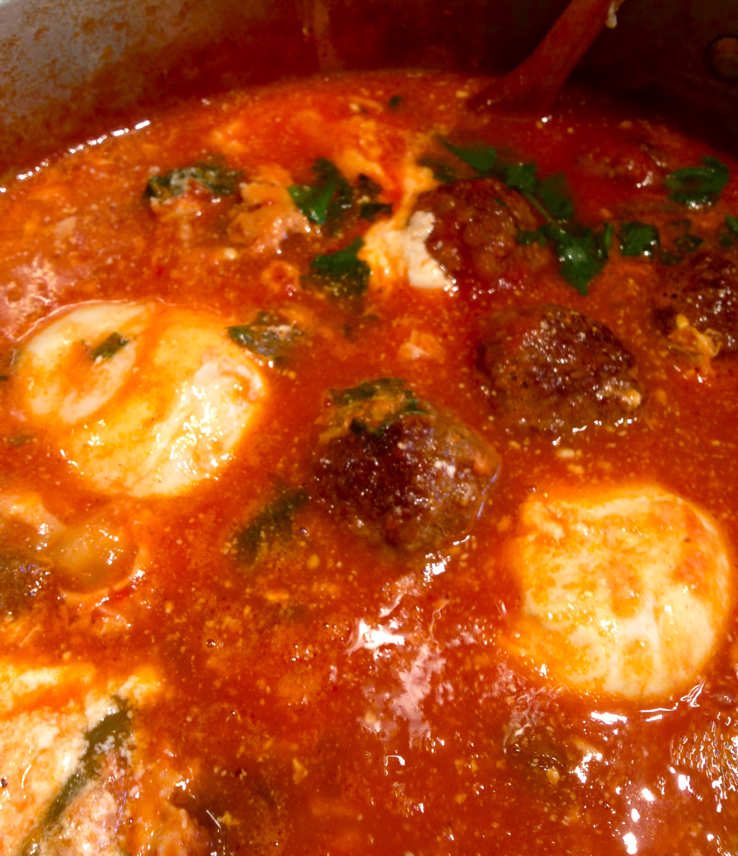 After 30 minutes, add blobs of yogurt and the eggs. Simmer on low for about 10 more minutes, this will poach the eggs and leave them with firm whites and runny yolks. Check the eggs at 5 minutes to see how they’re coming along, strain them out when the eggs are the way you like them, cooked soft or hard, your choice. I like runny yolks. Sprinkle the cilantro and mint torn in small pieces over the whole stew. Finish with a good drizzle of extra virgin olive oil.