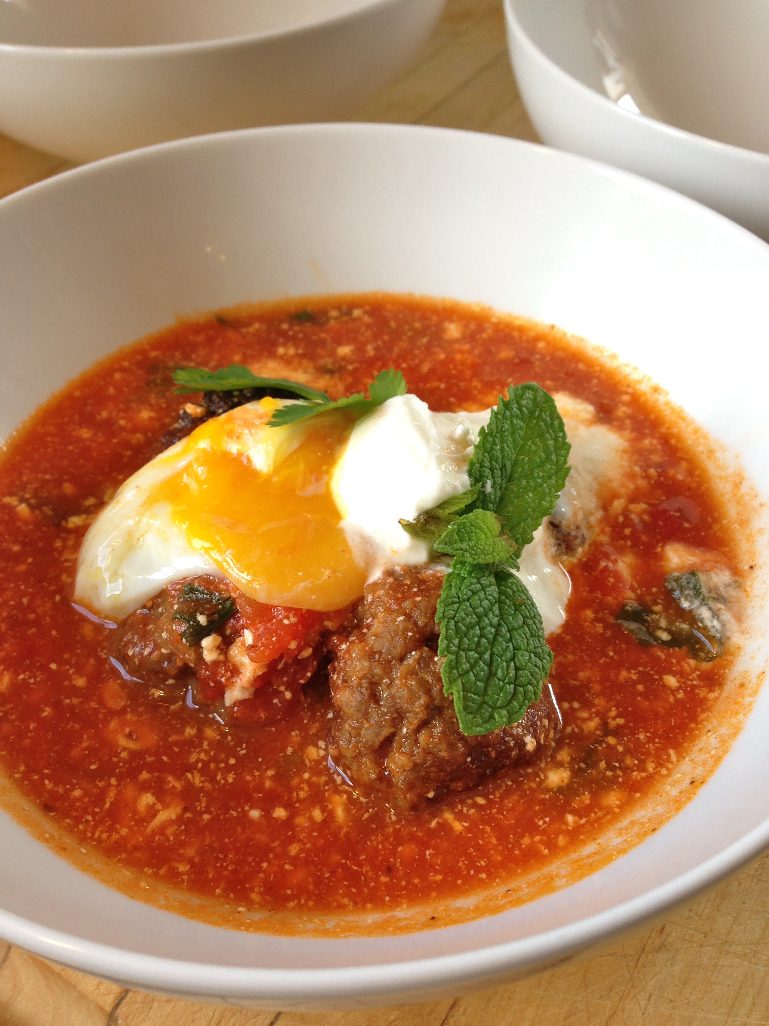 Look at that! Rich tangy tomato sauce, tender perfect meatballs, creamy egg yolk, cool plain yogurt and refreshing mint. I figured this dish would be fun to make with a team of friends, so I enlisted some of my fav foodies. What a blast we had cooking, sipping wine and laughing. They were all amazing helpers, which allowed me to get some good photos. Thanks to Lauren, Cathie and Stuart for all your help. You all are welcome to come cook with me anytime!