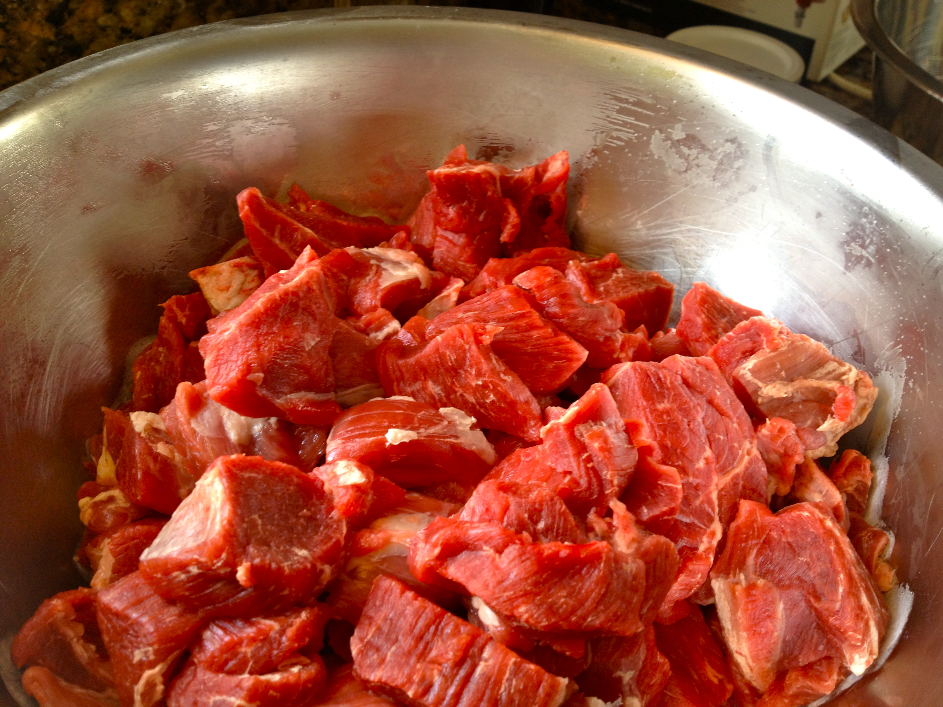 First step – place cubed lamb meat into a bowl and set in freezer for an hour or so until the edges get crunchy and slightly frozen.