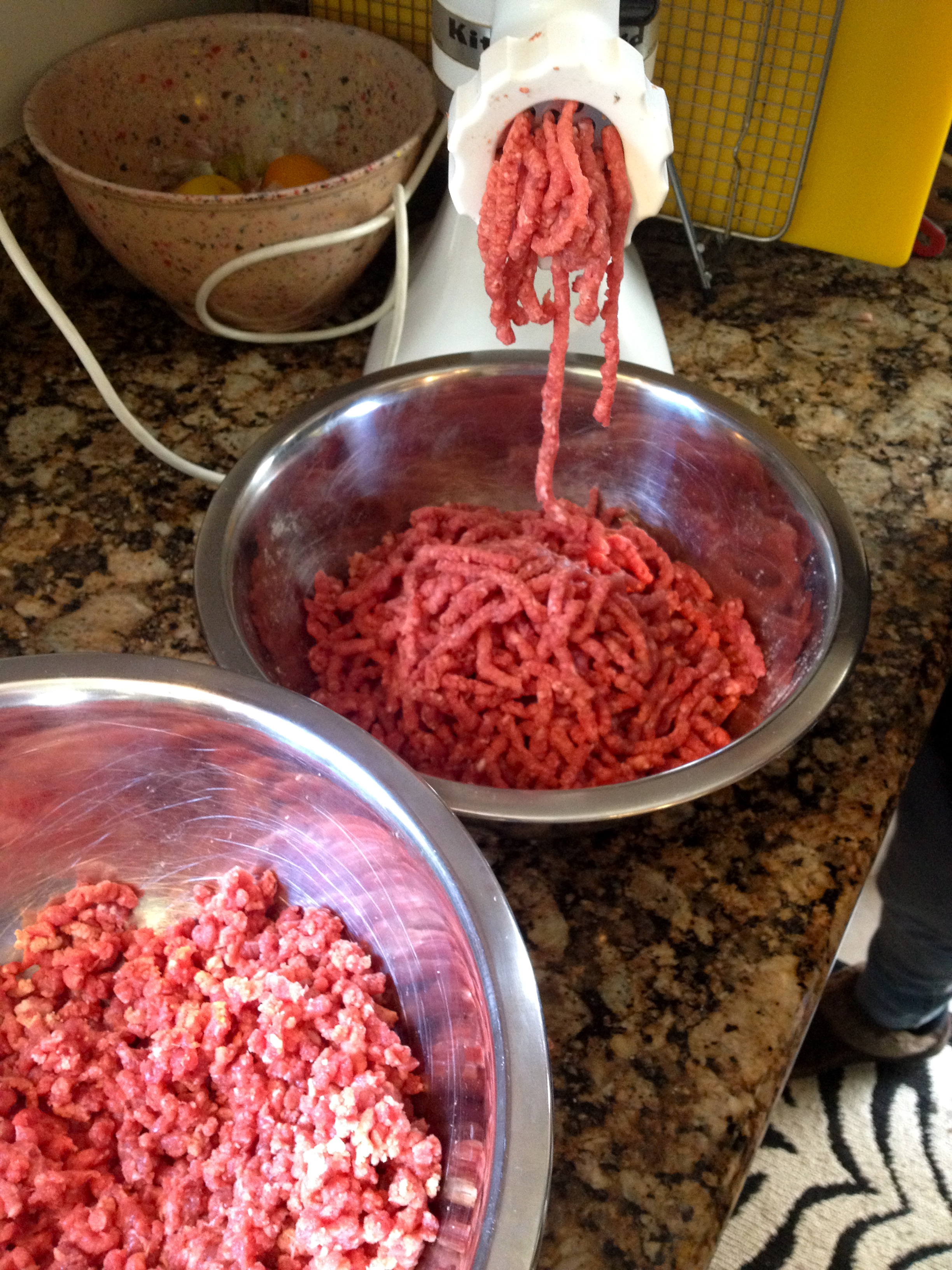 You will also need a meat grinder, the attachment for the kitchen aid stand mixer works perfectly. April says grinding the meat yourself will produce a light, airy and delicate ground meat. Commercially ground meat is over worked, sticky and paste like. She was right, the meatballs came out amazingly tender and light. I will forever grind my own meat:)