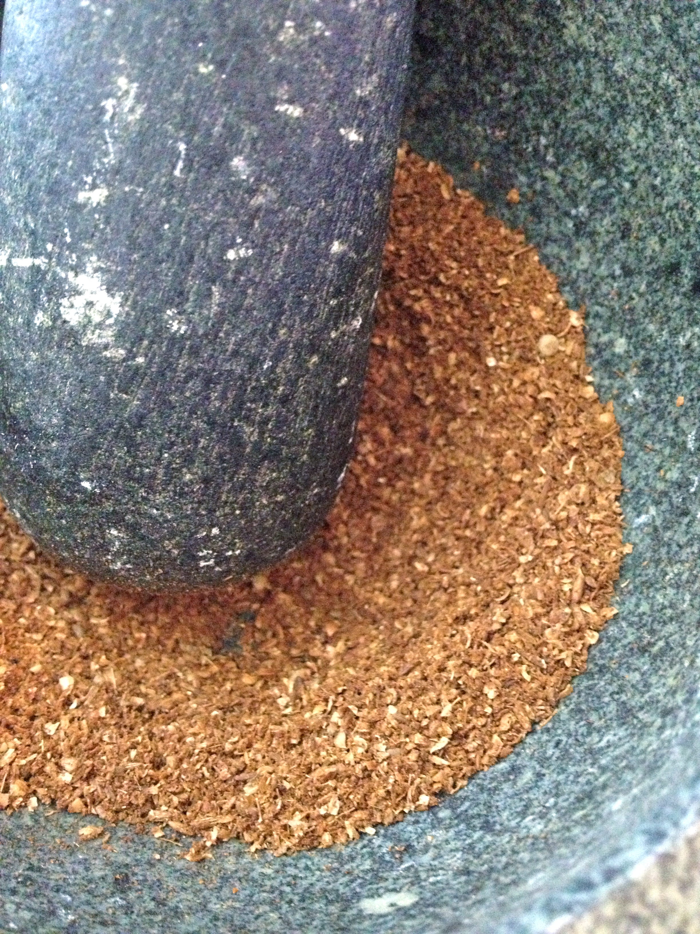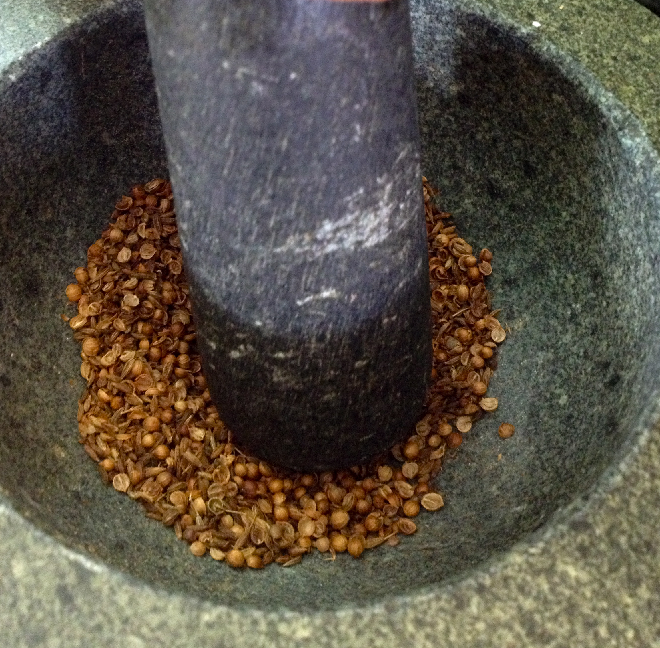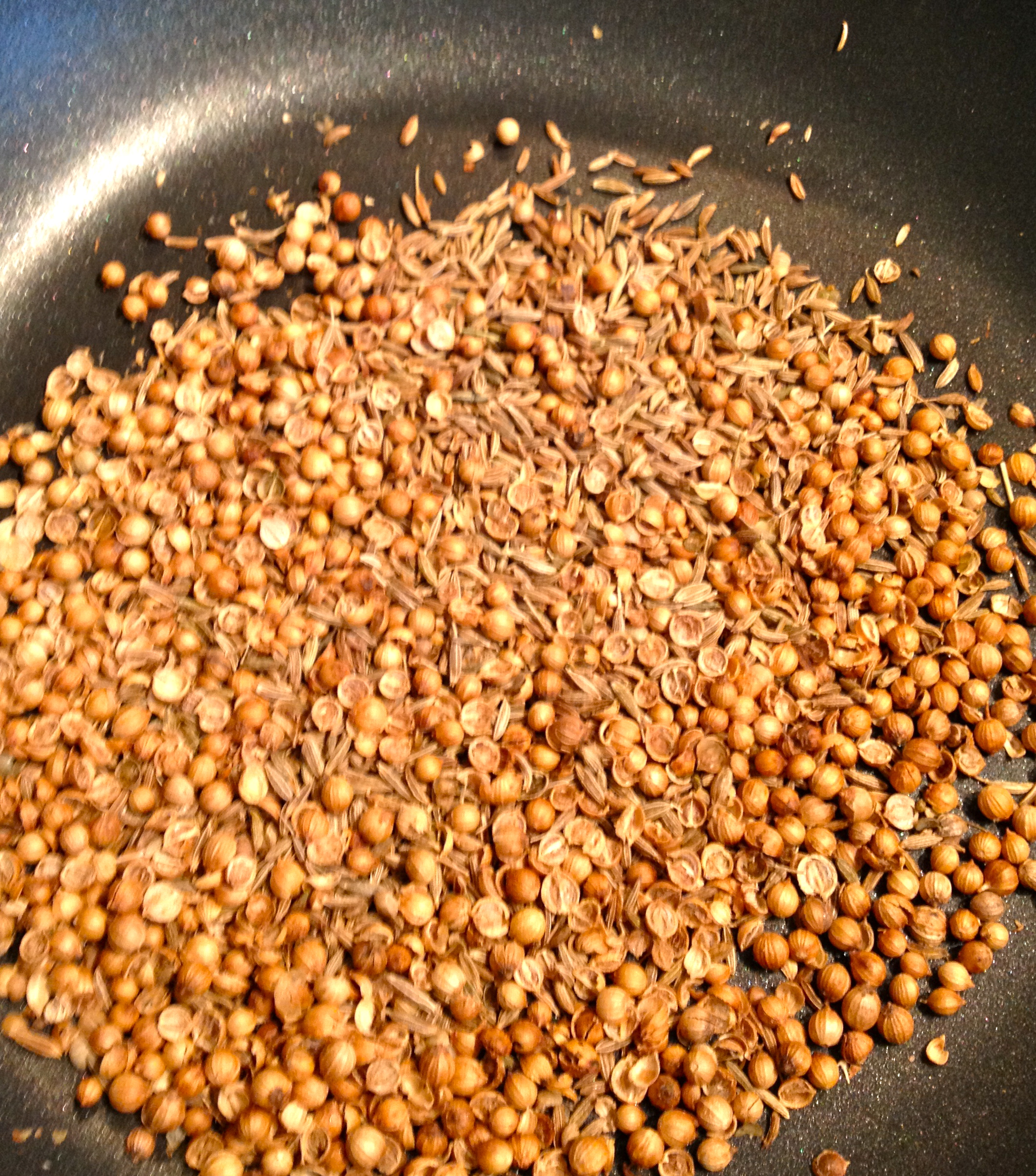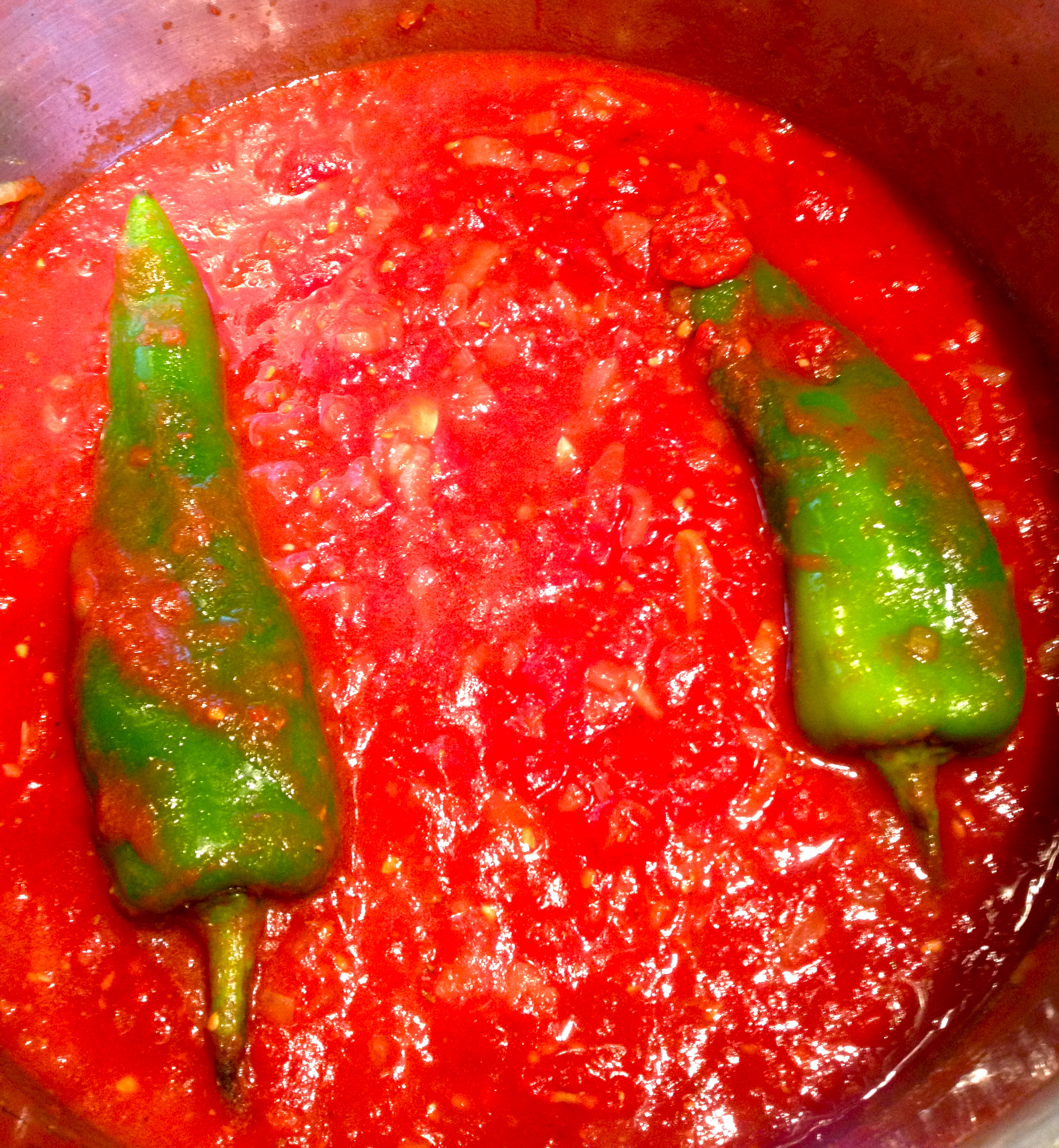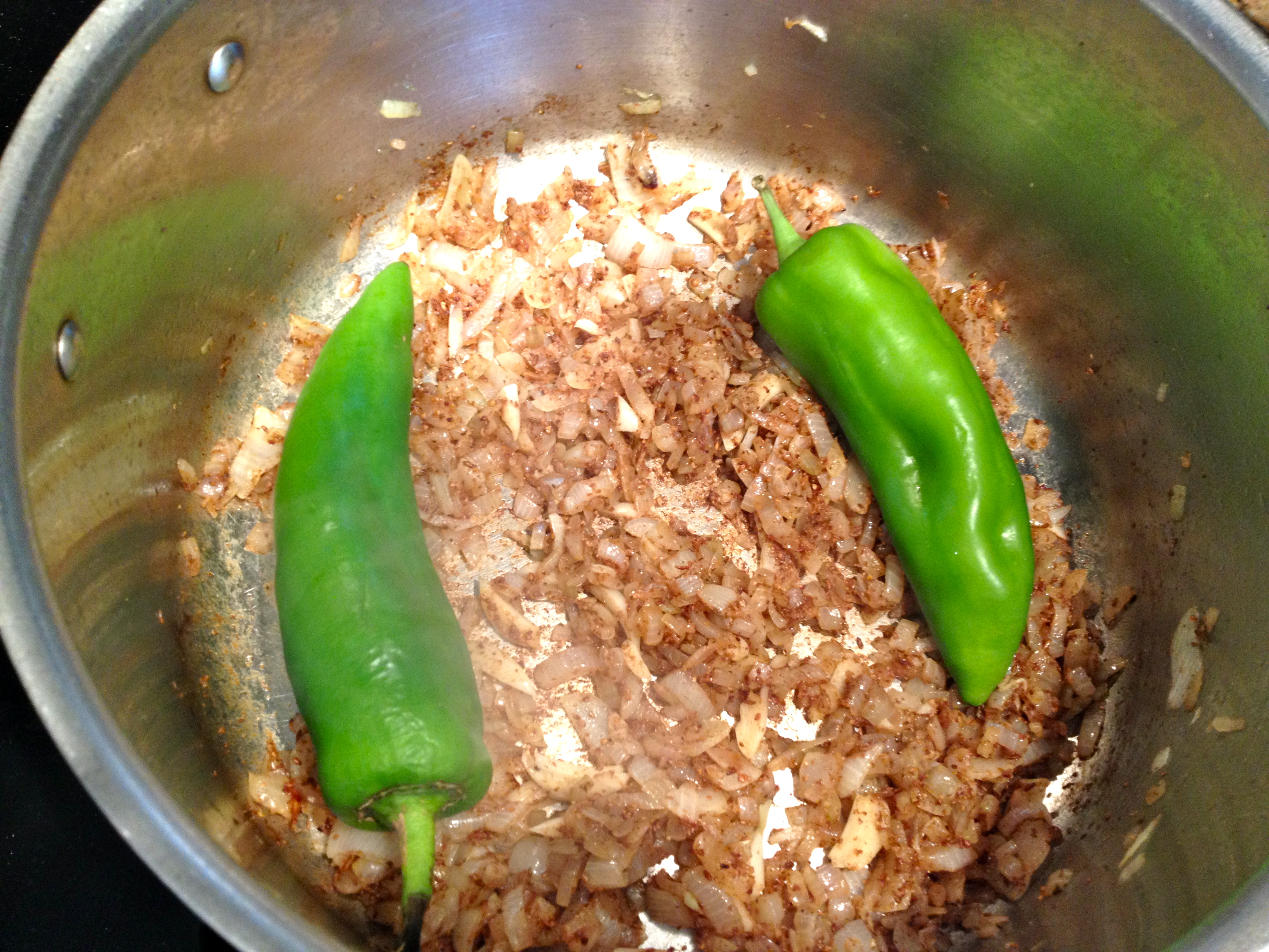 Over a high heat saute the onions and garlic for about 5 minutes, then add the ground spices . Add pierced chilies (I couldn’t find long red chilies so I used green ones) and the squished tomatoes. Simmer for 10 minutes then add 4 cups of water, bring to boil, turn down to a low simmer for 5 minutes.